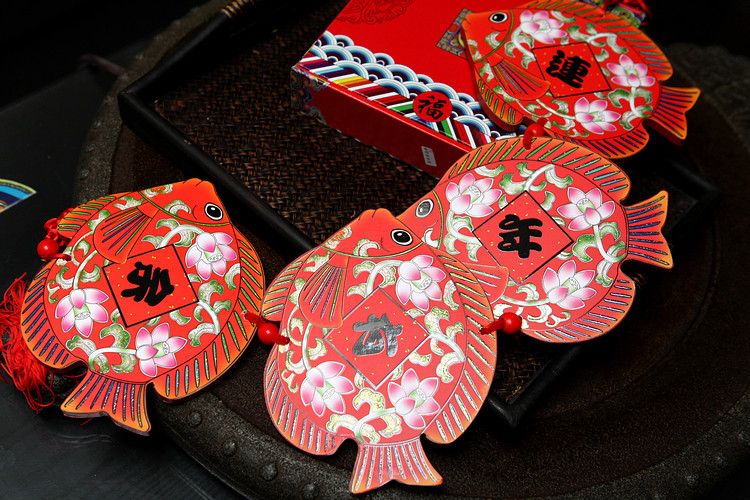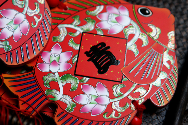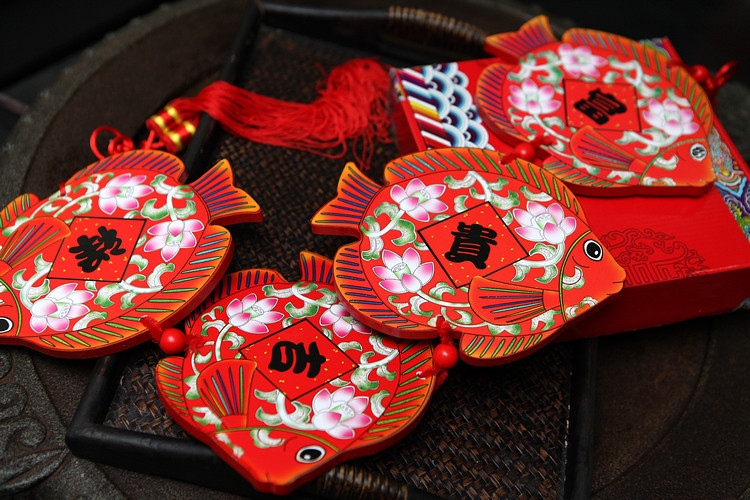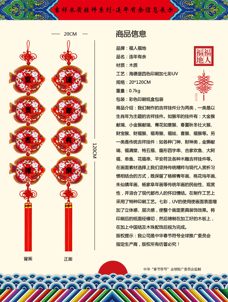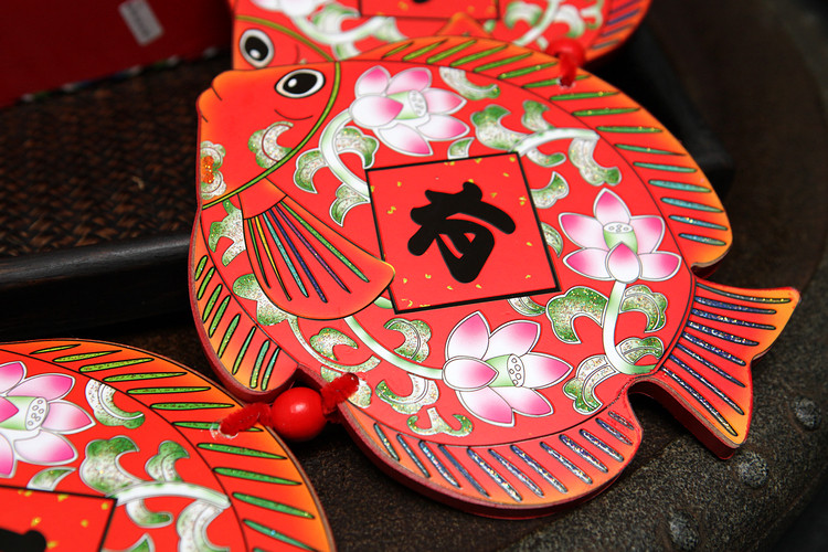 吉祥挂件:如各种门神、财神类,金狮献瑞、福满堂、特五福、扇形四字串、合家欢鱼、大阿福、串鱼、花