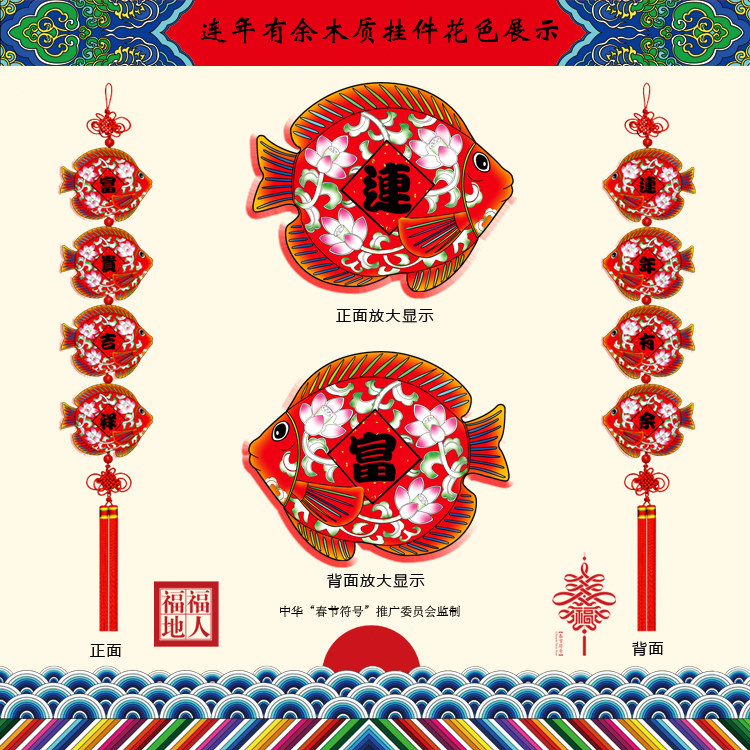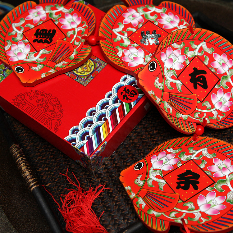 使整个画面更具装饰效果。将印刷后的纸面经模切,然后裱制在加工好的木板上,在加上中国结及木珠配饰